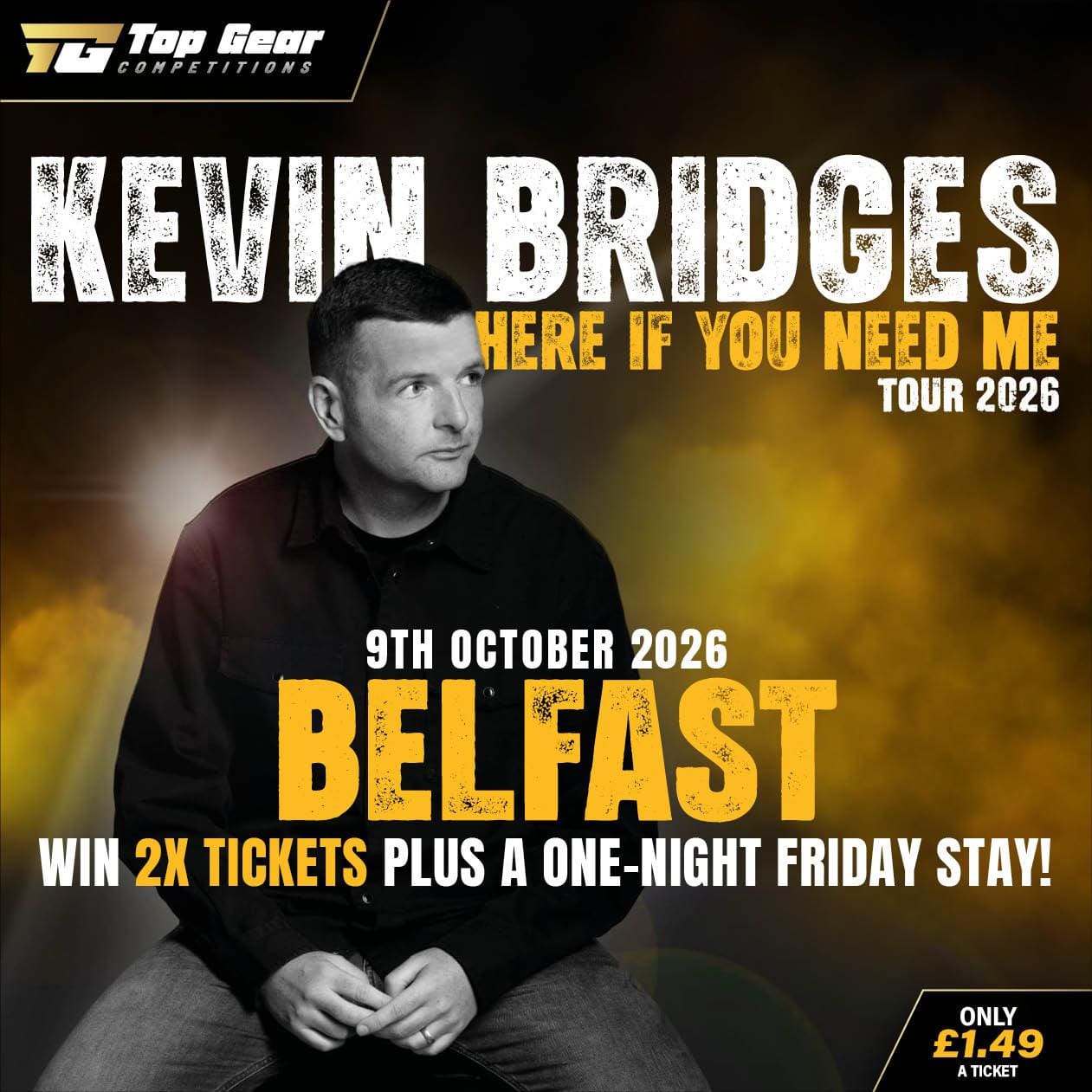 Win the Kevin Bridges Belfast Experience — two tickets to see Kevin Bridges LIVE at the SSE Arena, Belfast, on Friday, 9 October 2026, followed by an overnight stay in Belfast City Centre to continue the celebrations in style.